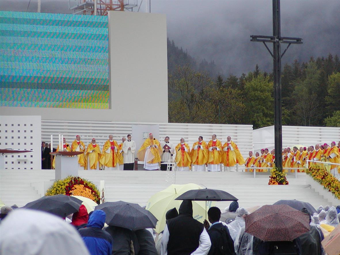 Pomalu začalo představování jednotlivých zemí na hlavní tribuně doprovázeno svědectvím ze života a modlitbou. Při představování naší České republiky jsem na chvíli, asi na 2 až 3 vteřiny, zahlédla za mraky prosvitovat sluníčko, ale byly to opravdu asi jen okamžiky. Jinak po celou dobu vytrvale, chvíli méně, chvíli více, pršelo.