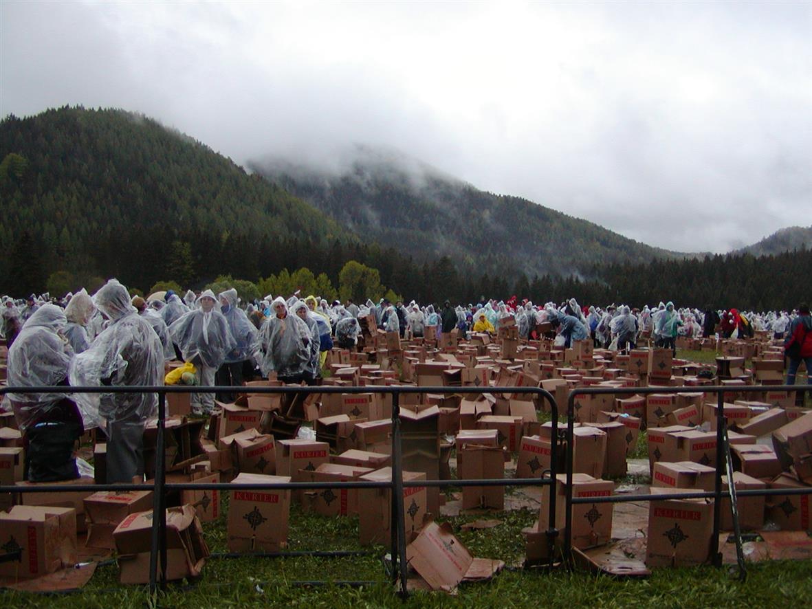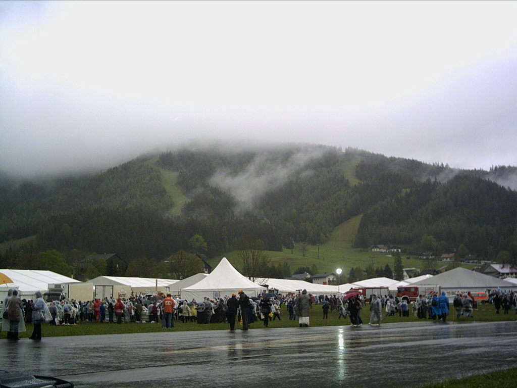 Po zakončení slavnostní mše svaté, začalo se prostranství plné lidstva přesouvat směrem k autobusům. Někteří ještě zašli na teplou polévku, ale široká masa promoklých a prochladlých poutníků už se těšila na lepší úkryt, než skýtala mariazellská louka. Vycházeli jsme asi kolem 2.hodiny odpolední, plní elánu a naděje, v důvěře, že autobusy jsou 3 km od jezera, kde jsme ráno vystoupili v domnění, že do půl čtvrté, kdy jsme měli sraz u autobusu, to musíme stihnout, netušíce, co nás ještě v závěrečné etapě pouti čeká.